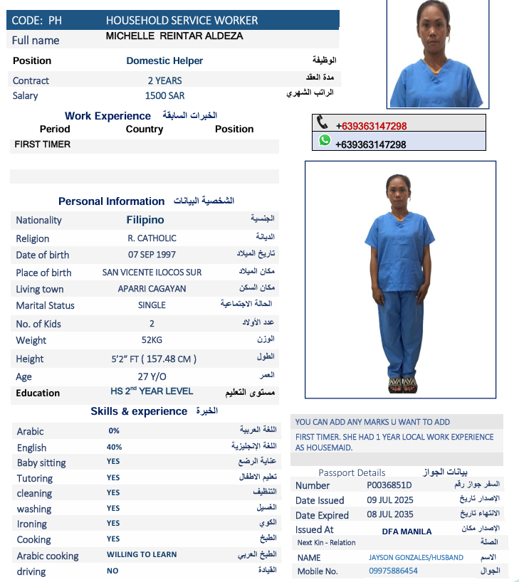 | ملاحظات: | YOU CAN ADD ANY MARKS U WANT TO ADD FIRST TIMER. SHE HAD 1 YEAR LOCAL WORK EXPERIENCE AS HOUSEMAID |